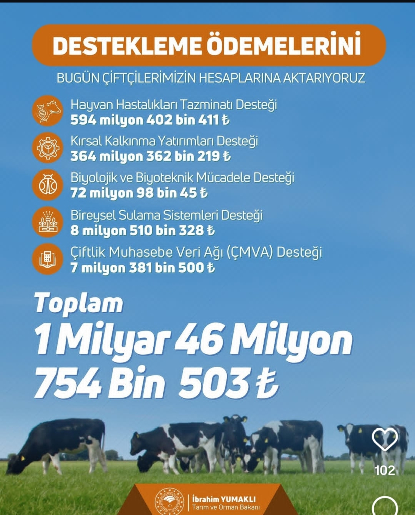 Yumaklı yaptığı açıklamada, “Desteklerimizle üreticimizin gücüne güç katıyor, emeğine sahip çıkıyoruz. 1 milyar 46 milyon TL tarımsal destek ödemesi bugün çiftçilerimizin hesaplarına aktarılıyor. Hayırlı ve bereketli olsun.” ifadelerini kullandı.