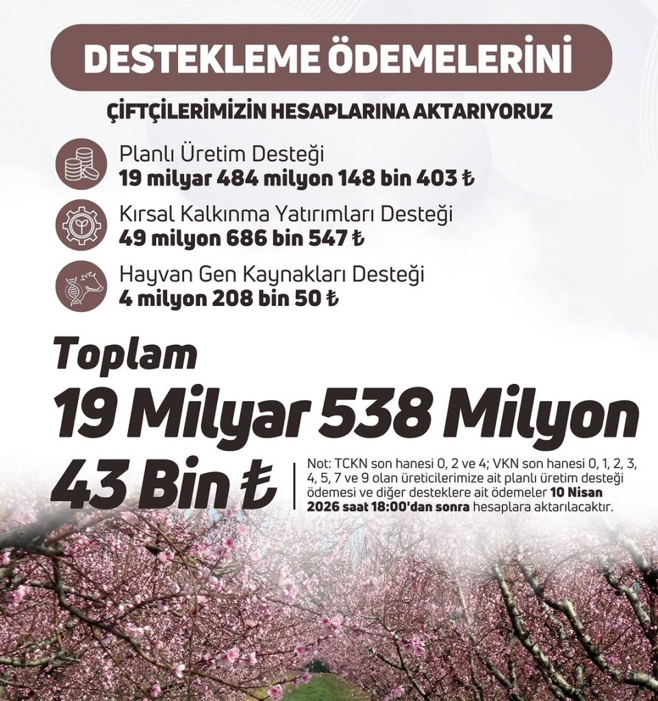 Paylaşımda yer alan bilgiye göre, planlı üretim desteği için 19 milyar 484 milyon 148 bin 403 lira, kırsal kalkınma yatırımları desteği için 49 milyon 686 bin 547 lira ve hayvan gen kaynakları desteği için 4 milyon 208 bin 50 lira ödeme yapılacak.