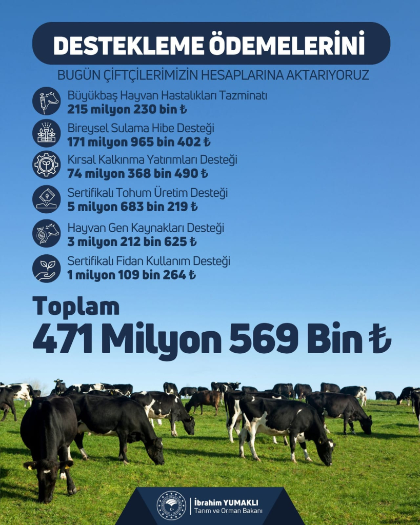 Tarım ve Orman Bakanı İbrahim Yumaklı, 471 milyon 569 bin lira tarımsal destek ödemesinin bugün çiftçilerin hesaplarına aktarılacağını bildirdi.