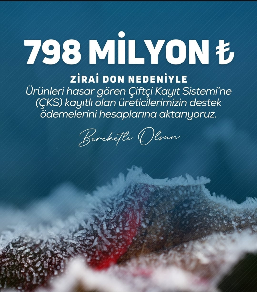 Bakan Yumaklı; “Zirai don nedeniyle ürünleri hasar gören Çiftçi Kayıt Sistemi’ne (ÇKS) üreticilerimize önceki ödemelerin devamı olarak 798 milyon TL destek ödemesini de çiftçilerimizin hesaplarına aktarıyoruz.