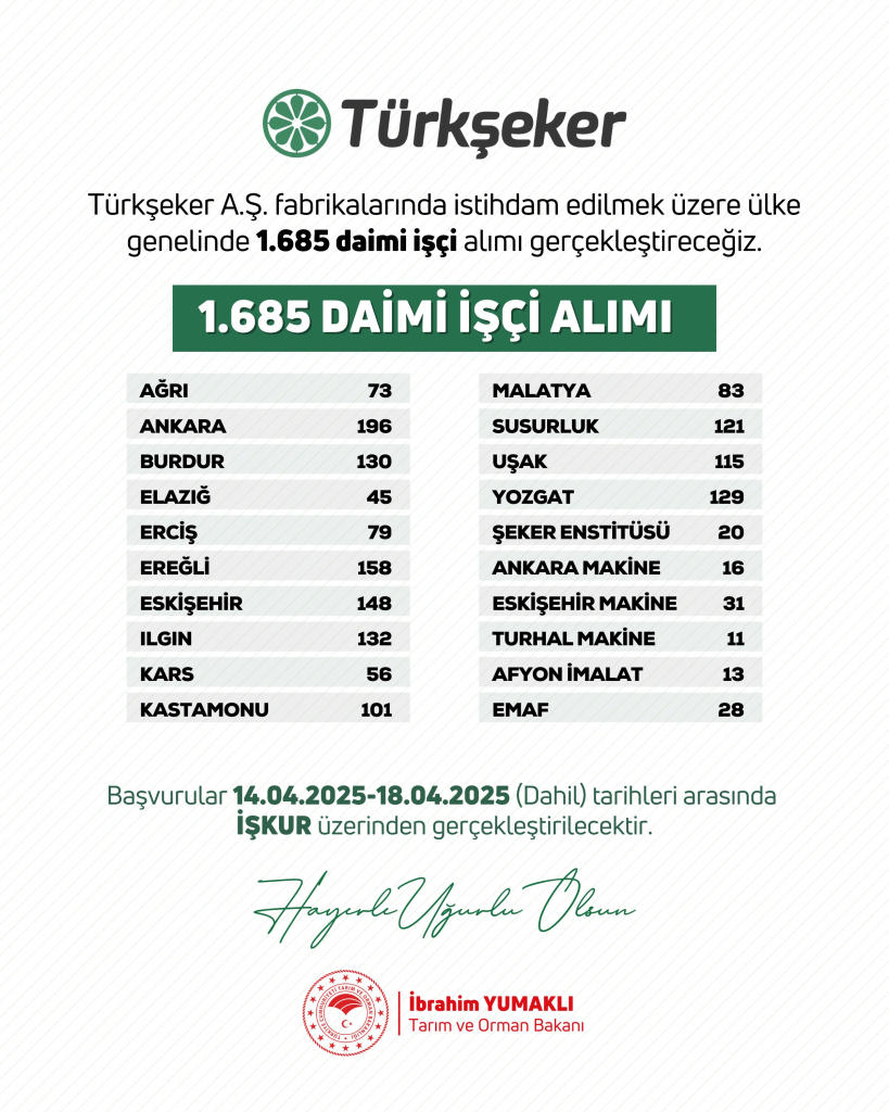 Tarım ve Orman Bakanı İbrahim Yumaklı, sosyal medya hesabından yaptığı paylaşımda Türkşeker A.Ş’nin fabrikalarda istihdam etmek üzere toplam 1685 daimi işçi alımı yapacağını bildirdi. Başvurular 14 Nisan ile 18 Nisan tarihleri arasında İŞKUR üzerinden gerçekleştirilecek. İşçiler fabrika ve tesislerde istihdam edilecek.