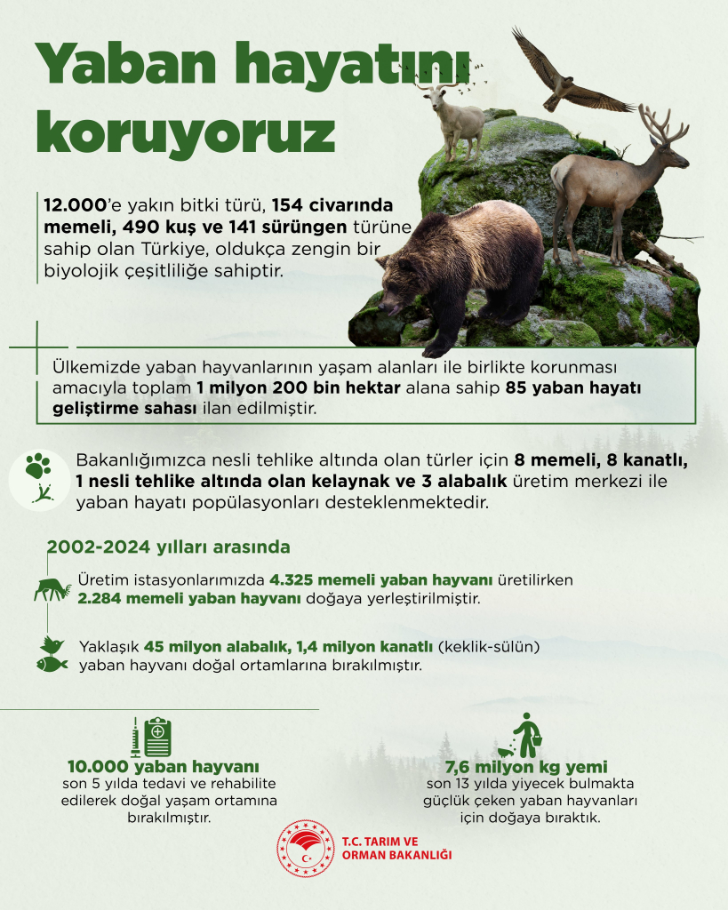 “Ülkemizde yaban hayvanlarının yaşam alanlarıyla birlikte korunması amacıyla toplam 1 milyon 200 bin hektar alana sahip 85 yaban hayatı geliştirme sahası ilan edilmiştir. Bakanlığımızca nesli tehlike altında olan türler için 8 memeli, 8 kanatlı, 1 nesli tehlike altında olan kelaynak ve 3 alabalık üretim merkeziyle yaban hayatı popülasyonlarını desteklenmektedir.”